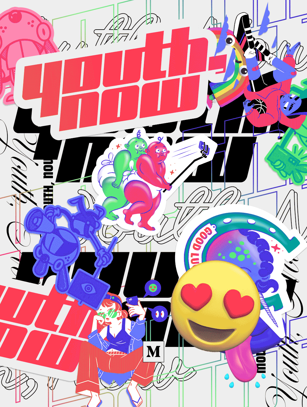 Digital stickers collaged with various illustrations. Originally published on Medium's online September 2018 issue, "Youth, Now"